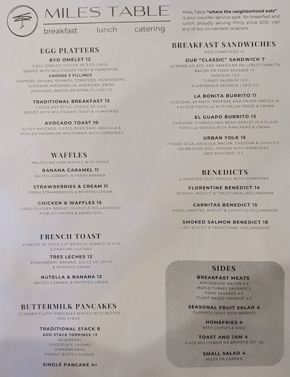 Welcome to Miles Table, nestled in the heart of Philadelphia at 1620 South St. This delightful eatery has quickly gained a reputation for its scrumptious offerings and exceptional service. Whether you're stopping by for a quick coffee or an indulgent brunch, you're in for a treat!